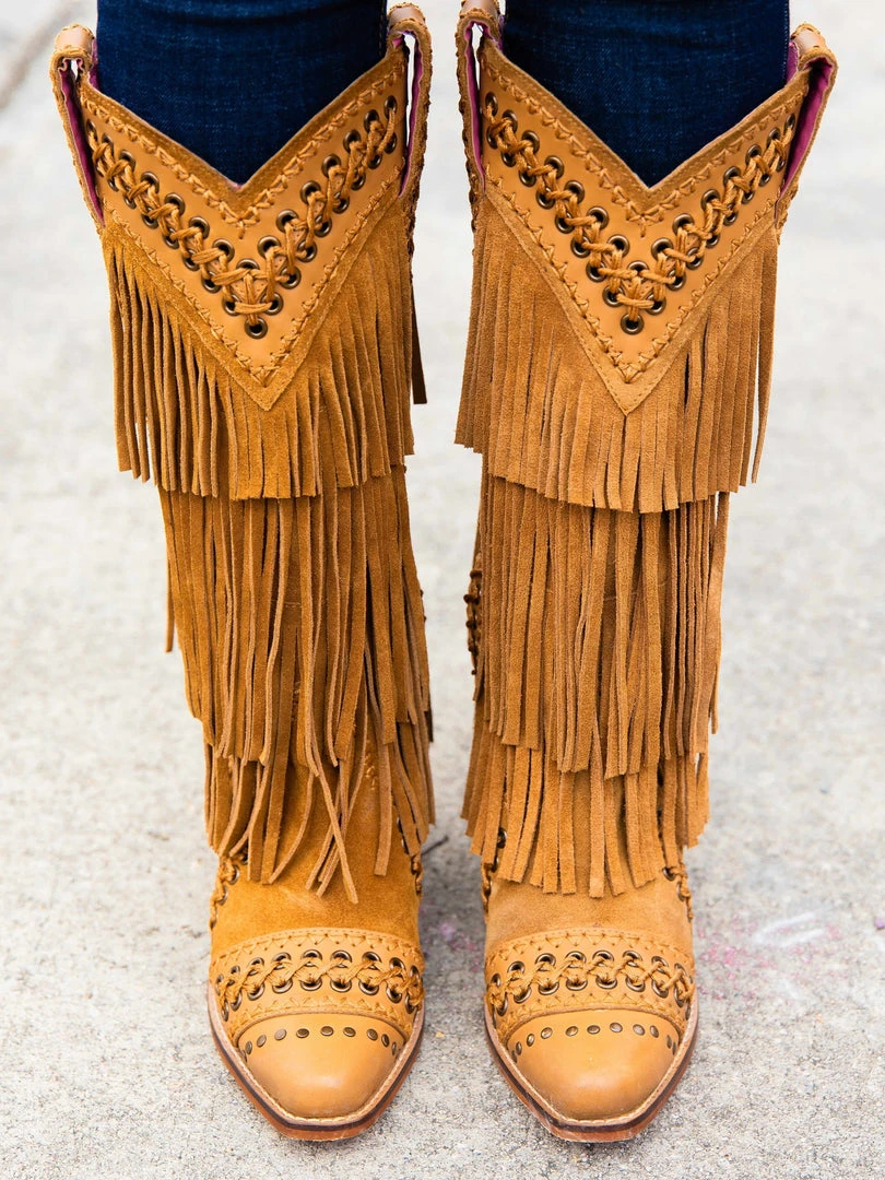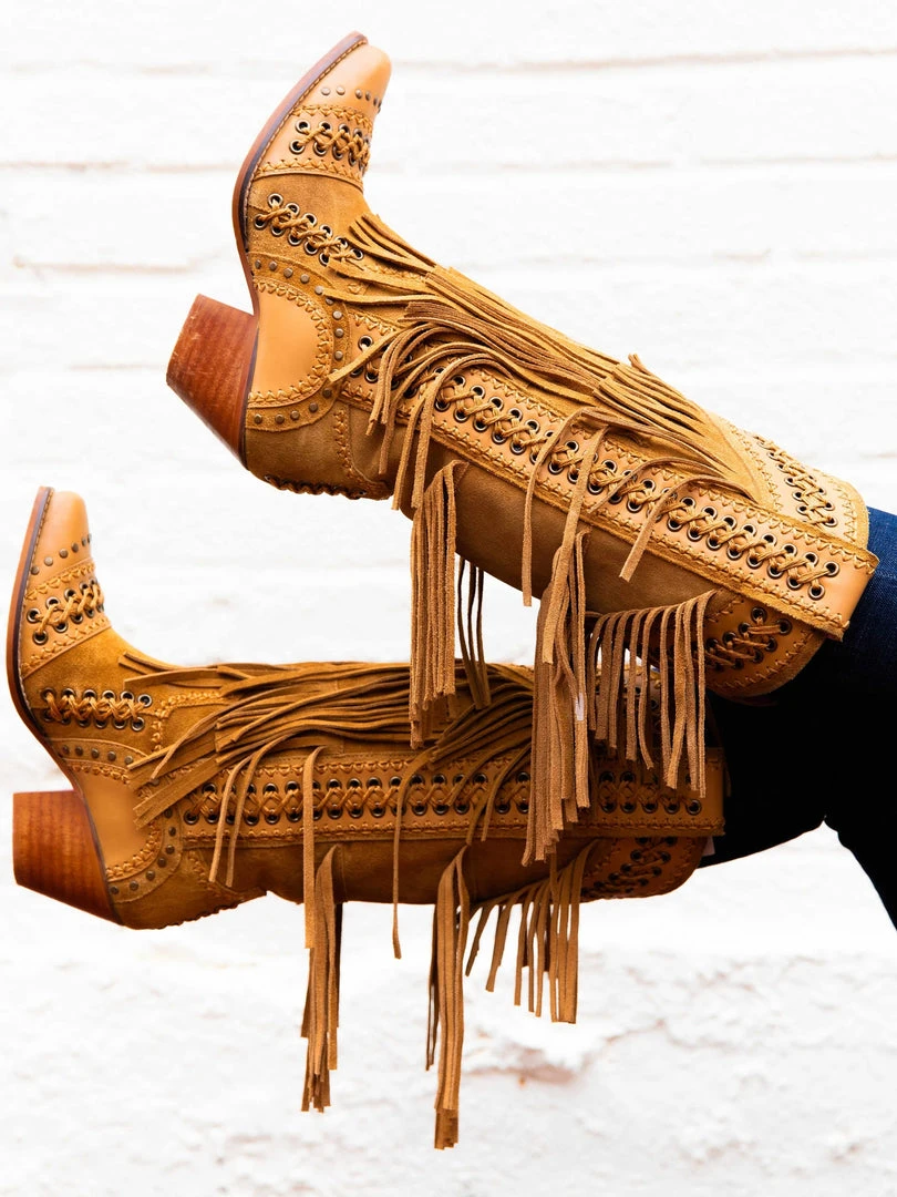 These boots are absolutely stunning! The tan leather is high quality and the fringe adds a unique touch. Perfect for any cowgirl look.