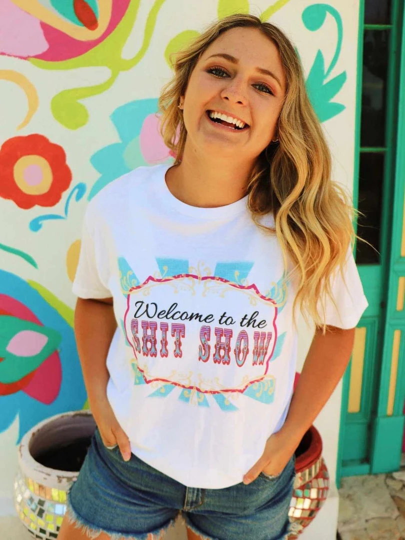 So funny! Our “Welcome To The Shit Show Tee” is so cute and funny! Available in curvy sizes, true to size. Go with your regular tee shirt size!