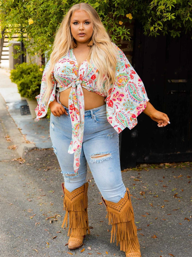 Talk about versatility! This top is going to be the hottest thing this spring and summer! This crop top features a beautiful white floral print. It is very flowy and will keep you cool all day and night! If you don’t want to tie it up, you can wear it untied and add a tank under it. The bell sleeves are so comfortable and flowy! Great for all day wear! This top pairs perfectly with your high-waisted denim pants and your favorite denim shorts! Toss on your western cowgirl boots for a southern style or pair with wedges to dress it up!