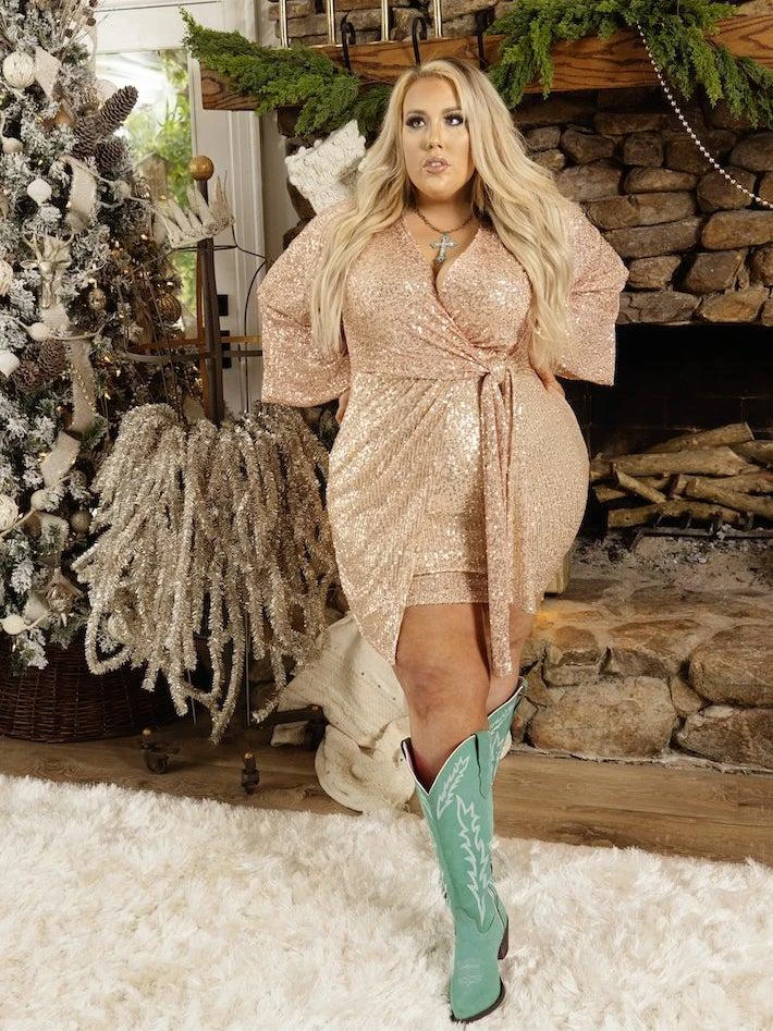 Turn up the glow factor in the “Charlene,” a shimmering gold dot sequin wrap dress with bell sleeves and tie waist. This one is definitely made for making a scene. Part of the SFC collection, Curvy Chic approved, and designed by our owner Liz.