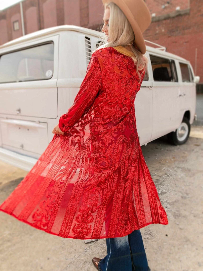 This handmade long kimono sequin duster is absolutely AMAZING! Great for special occasions, dates, or concerts. Even special for holidays like Christmas and the 4th of July. With its lightweight flattering fit, it is sure to have you sparkle and shine anywhere you go! This piece is a LIMITED EDITION! Pair a duster with your favorite tops, bottoms or dresses for a sassy look!