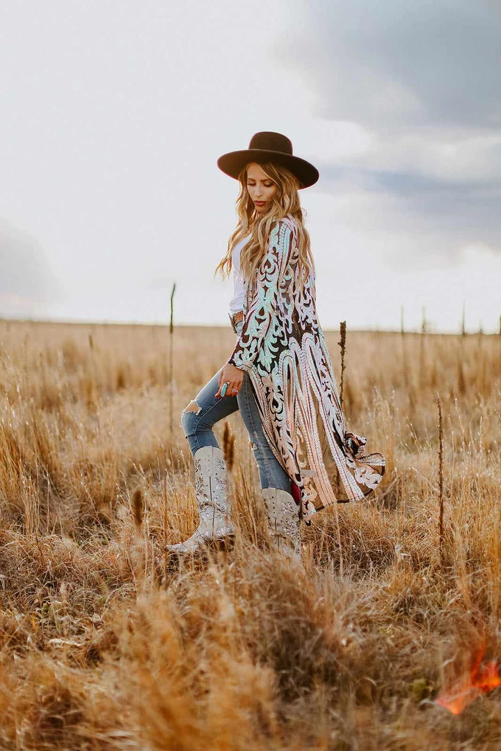 This handmade long kimono sequin duster is absolutely AMAZING! Great for special occasions, dates, or concerts. Even special for holidays like Christmas and the 4th of July. With its lightweight flattering fit, it is sure to have you sparkle and shine anywhere you go! This piece is a LIMITED EDITION! Pair a duster with your favorite tops, bottoms or dresses for a sassy look!