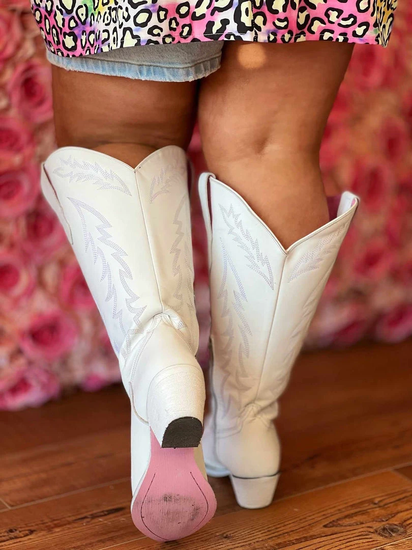 The Original Wide Calf Western “Loretta” Boot is now available for pre-order! This stunning western boot features trendy white leather and off white stitching. White boots & booties are all the rage right now for our Western Chics! Pink painted bottoms for a fun & flirty look.Â