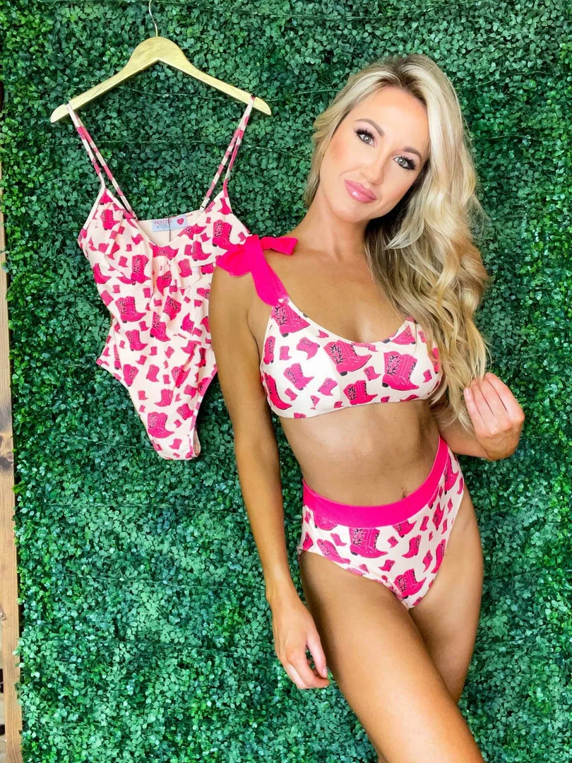 High Waisted Bikini Bottom in Pink and Cowgirl Boots